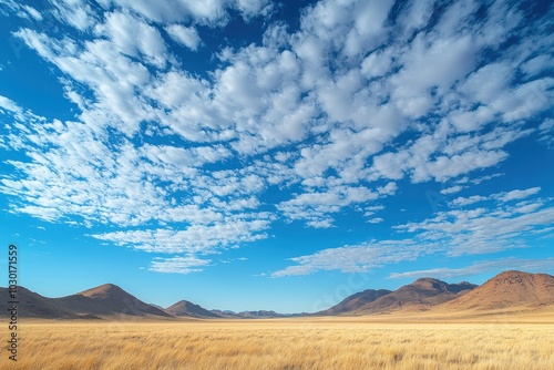Naklejka premium Golden grass field with scattered clouds and distant mountains under a bright blue sky