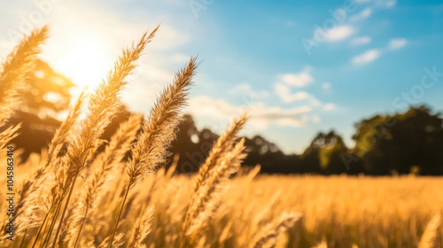 Fototapeta premium Golden grass sways gently in the warm light during sunset in a tranquil rural field