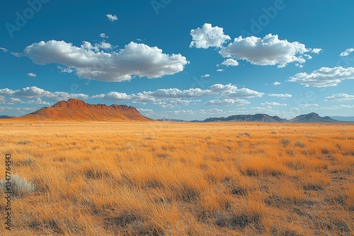 © Ali, Fototapeta premium Golden grasslands meet dramatic red rock mountains under a vibrant