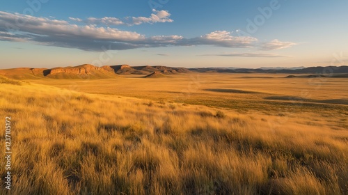 © Yopi, Fototapeta premium Golden Grasslands Sunset Landscape with Distant Mesas