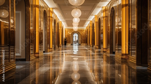 © MINHOO, Fototapeta premium Golden Hallway with Mirrored Walls and Chandelier