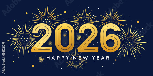 © Morjina, Naklejka premium Golden 2026 happy new year text with fireworks and confetti on dark blue background