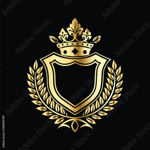 © printeye, Fototapeta premium Golden heraldic shield with crown. Heraldic Coat of Arms decorative logo isolated vector illustration. Luxury golden laurel wreath heraldic emblem template vector illustration.Heraldic Coat of Arms de