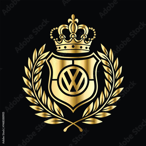 © printeye, Fototapeta premium Golden heraldic shield with crown. Heraldic Coat of Arms decorative logo isolated vector illustration. Luxury golden laurel wreath heraldic emblem template vector illustration.Heraldic Coat of Arms de