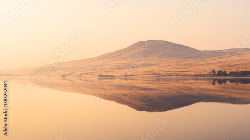 Naklejka premium Golden Hill Reflected in Still Lake at Sunrise