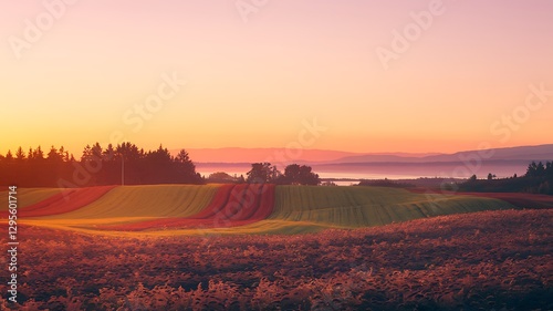 © Darunee, Obraz premium Golden Horizon: Scenic landscape during sunrise or sunset, painted with warm, inviting colors. Farmland gently rolling towards the horizon with an enchanting, soft, dreamy light.