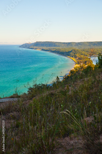 Obraz premium Golden Hour at Empire, Michigan: Lush Forested Coastline View from Above