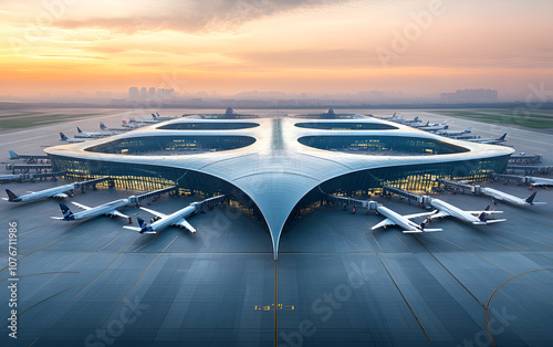 © mona, Obraz premium "Golden Hour at the Airport: Planes and Ground Operations"
