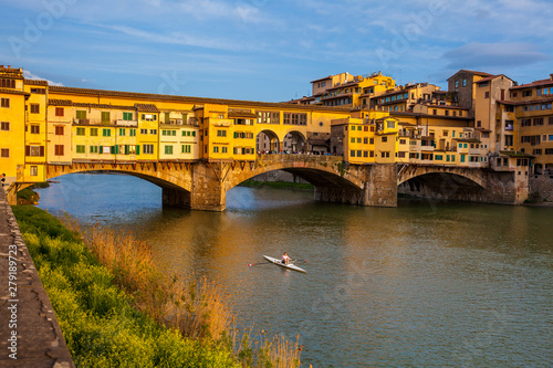 © anamejia18, Obraz premium Golden hour at the Ponte Vecchio a medieval stone closed-spandrel segmental arch bridge over the Arno River in Florence