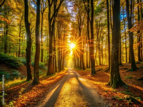 © nick, Obraz premium Golden hour bathes a sunlit forest path, creating a magical silhouette scene.