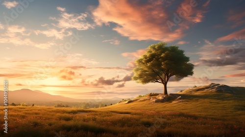 Obraz premium Golden hour bathes a tranquil meadow in warm hues