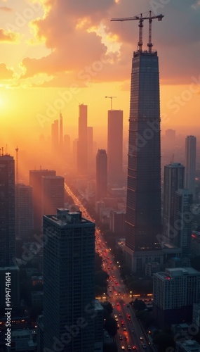 Fototapeta premium Golden hour bathes cranes and skyscrapers under construction in a sweeping...