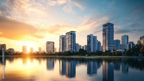 Fototapeta premium Golden Hour Cityscape: Breathtaking Sunset over Modern Skyline Reflected in Calm Waters