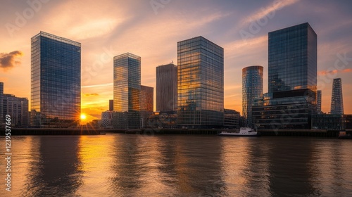 © Anak, Fototapeta premium Golden hour cityscape with reflection on the water of modern buildings