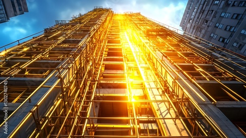 © terat, Fototapeta premium Golden Hour Construction: Skyscraper Under Construction - Urban Dev.