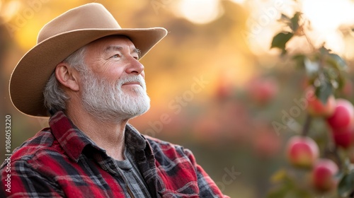 © Andrei, Obraz premium Golden Hour Dreams Contemplative Senior Farmer Reflects in the Warm Light of Sunset at his Orchard