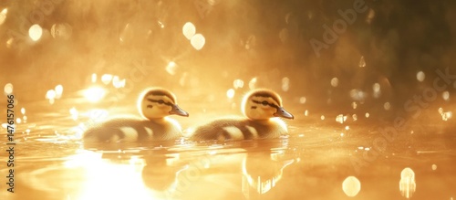 © BISMILAH, Fototapeta premium Golden Hour Ducklings: A Serene Sunset Reflection