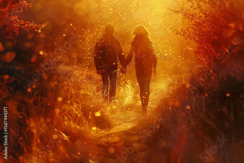 © DYAH, Fototapeta premium Golden Hour Embrace: Silhouetted Couple Walking Hand-in-Hand Through a Magical Autumnal Path, Illuminated by Warm Light and Sparkling Dust Motes