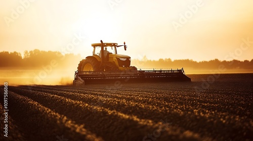 Fototapeta premium Golden Hour Farming Tractor in Dusty Wheat Field at Sunrise : Generative AI