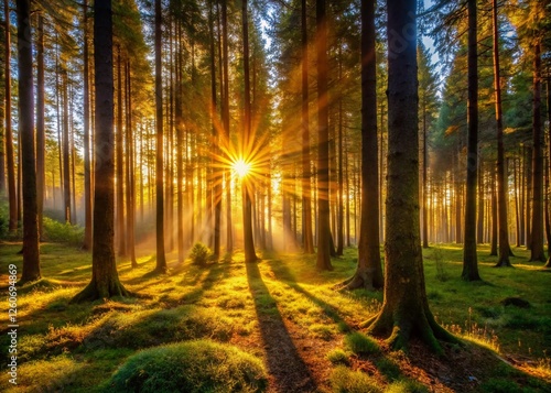 © prapatsorn, Fototapeta premium Golden Hour Forest: Backlit Trees in a Mystical Woodland