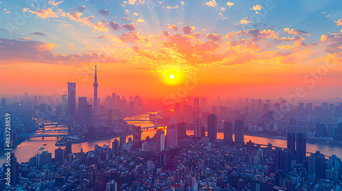 © wannapong, Obraz premium Golden Hour Glow Over City: Stunning Sunset Cityscape with Illuminated Buildings and Clear Sky