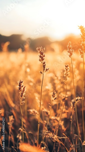 Fototapeta premium Golden Hour Grass Field with Sun Shining Through