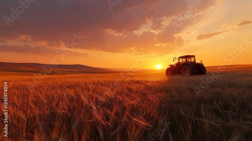 © San, Naklejka premium Golden Hour Harvest: Tractor in Wheat Field at Sunset