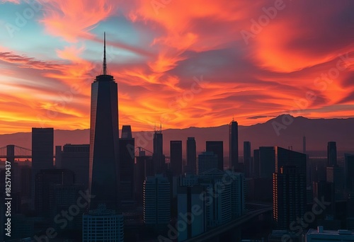 Fototapeta premium Golden hour hues paint cityscape, skyscrapers silhouetted against fiery sky,...