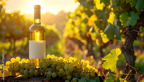 © Kurang, Fototapeta premium Golden hour illuminates a wine bottle and grapes in a vineyard