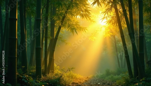 © Namtip, Naklejka premium Golden hour illuminates dense bamboo, creating a mystical atmosphere , stock photo, serene