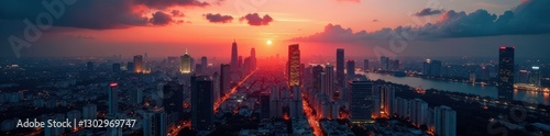 Obraz premium Golden hour illuminates Saigon's towers, night descends, amazing,...