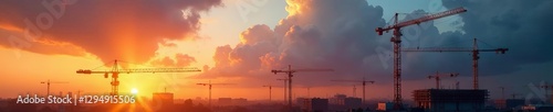 © aoc, Fototapeta premium Golden hour illuminates towering cranes and brooding clouds above a construction zone , work, light