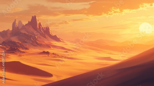 © purnama, Obraz premium Golden Hour Illuminating Arid Desertscape with Majestic Rock Formation