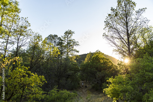 Obraz premium Golden hour in a forest with a mountain view