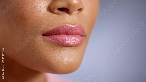 © Nitchalee N., Obraz premium Golden hour in minimalist scene, Close-up of smooth, glowing skin and pink lips with subtle makeup on a woman's lower face against a soft light background.