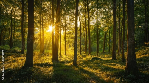 © Hewul, Obraz premium Golden Hour in the Forest: A Serene Sunset Scene