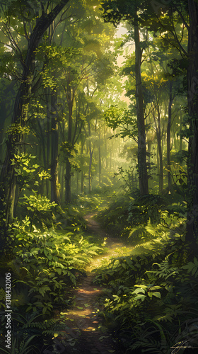 Fototapeta premium Golden Hour in the Forest: Serene Landscape Featuring Lush Greenery and a Meandering Pathway