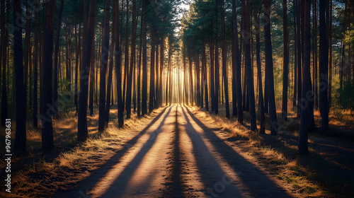 Obraz premium Golden Hour in the Woods: A Peaceful Stroll