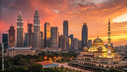 Obraz premium Golden Hour Kuala Lumpur Skyline Mosque and Skyscrapers Composition,...