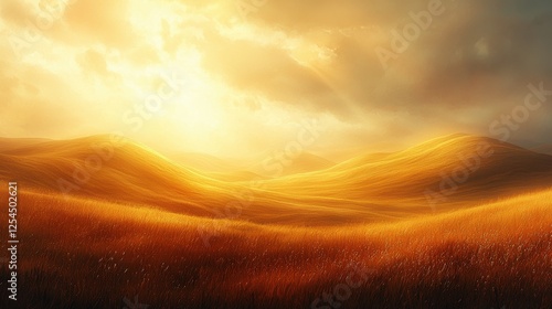 © abrardsgn, Obraz premium Golden Hour Landscape: Sunlit Hills and Fields