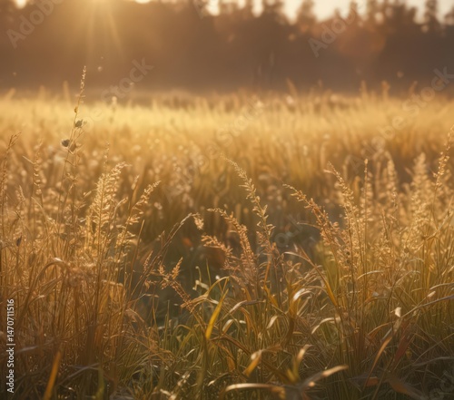 Obraz premium Golden hour light bathes abstract autumnal meadow in hazy glow Dew-kissed grasses shimmer , dew, countryside