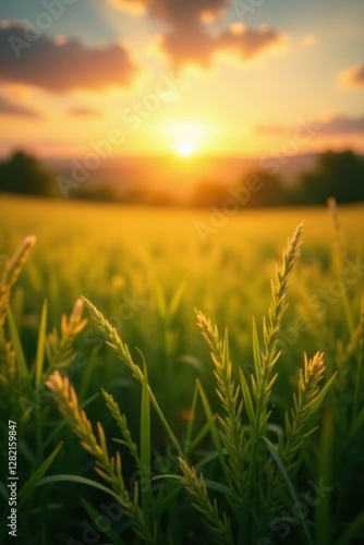 Fototapeta premium Golden hour light bathes idyllic meadow, blurred sunset , photo, sun