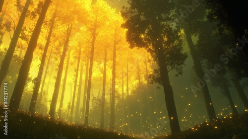 Obraz premium Golden hour light illuminates a mystical forest with glowing fireflies.