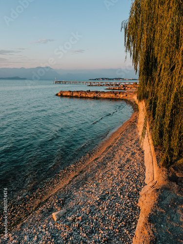 Fototapeta premium Golden hour light illuminating pebble beach and willow tree by Lake Geneva...