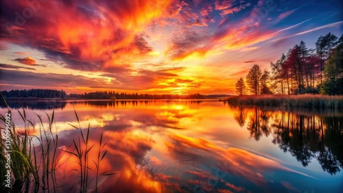 © dokrak, Fototapeta premium Golden hour magic: Double exposure captures sunset's fiery reflection on tranquil lake waters.