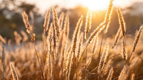 © sungedi, Fototapeta premium Golden Hour Meadow - A Serene Landscape of Sunlight and Grasses.