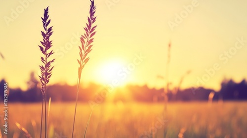 © Big9869, Fototapeta premium Golden Hour Meadow Sunset Serenity and Grass Blades