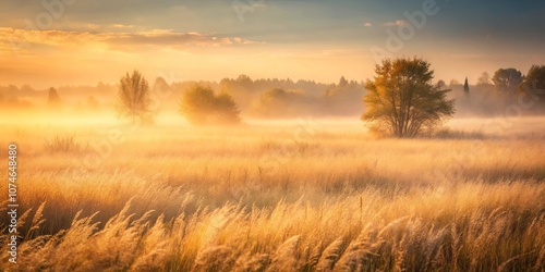 Obraz premium Golden Hour Mist Envelops A Field Of Tall Grass With A Single Tree Standing...