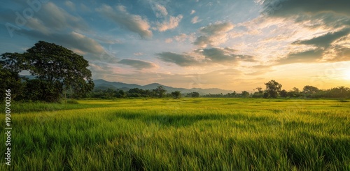 © Rmdan, Obraz premium Golden hour over a vibrant green field with trees, mountains, and clouds
