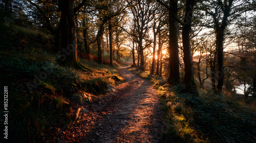© Nesham, Obraz premium Golden hour over lit path through quiet woods